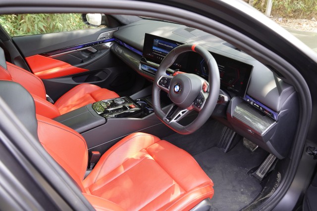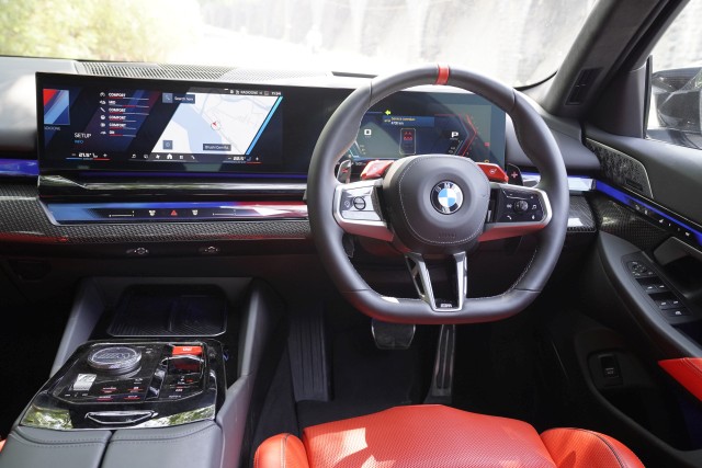 Inside, the racing red leather upholstery with contrasting black elements immediately captivates the senses. It is a hot day, but the equipment level in the M5 is peak 5 Series and there’s nothing I am left wanting. The large touchscreens and animated light bar I can do without, but it adds an element of drama for those who seek it. Not to mention the light-bar extensions in the door-panels also serve as blind-spot warnings. There is enough and genuinely perfect support to engage in the most demanding driving, um, antics one may wish to.