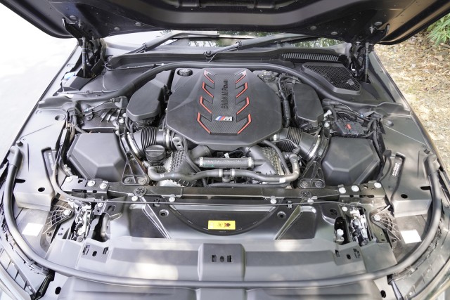 There’s so much to try and describe but, first, the bits we see. The Frozen Black exterior looks the part. The M light alloy wheels are 20-inch front and 21-inch rear, with 285/40 front and 295/35 rear rubber for maximum contact patch and effective torque transfer to the road. The M Carbon package brings tougher and lighter mirror covers, roof, and boot-lip spoiler. There are huge M compound brakes with red callipers for maximum stopping power. The details at the rear add to the appeal: a two-section diffuser packaging the twin dual-pipe exhaust finishers.