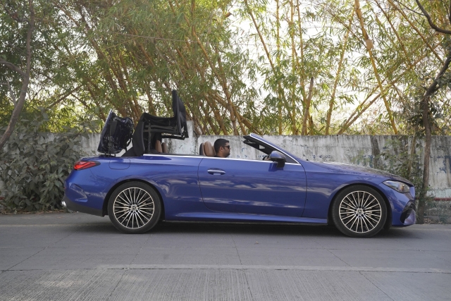 The sleek body and shapely contours do indeed evoke a sports car excitement that is hard to match and even harder to ignore. The desirability factor is high and so is the asking price of Rs 1.11 crore plus taxes and insurance and what have you. Our test car came with the black fabric soft-top and that complements the Spectral Blue paint finish. A matte grey magno shade is also available for an additional Rs 2.96 lakh. But back to the car. The sweeping side profile is reminiscent of cabriolets past and has the same effect. The rear is distinct with the wide split tail-light clusters underscored by an LED signature.