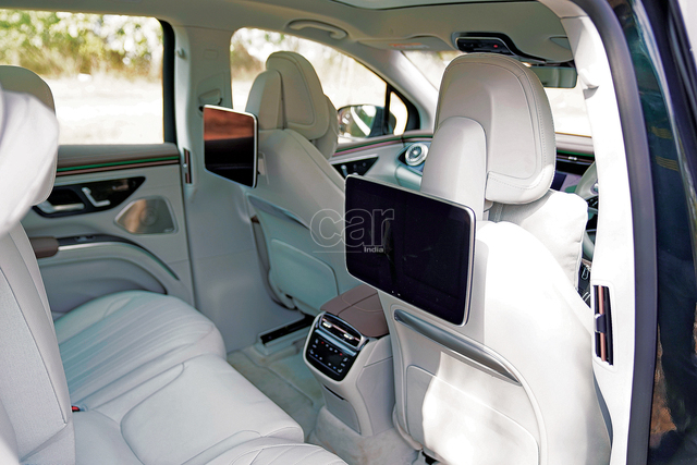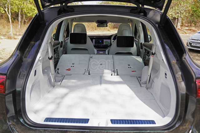 Such worries are quickly forgotten when one uses the massage function in the front seats. To add to that state of tranquillity, Mercedes have also equipped the EQS SUV with an impressive 15-speaker Burmester music system which supports wireless Apple CarPlay and Android Auto. Following a brisk drive, the switch to the second row was disappointing. The seats themselves are plush and above reproach, though. Furthermore, they also offer a comfortable position with adequate head-, knee-, and leg-room but fall short of the luxurious experience one has come to expect of the S-Class family. The rear seats do not offer massage functions, nor do they have electric window blinds. Cooled seats are more relevant to most of our country but this car offers heated seats only. Overall, the second-row comfort of the EQS is good but not good enough for the S-Class brand and nowhere as luxurious as the Maybach EV. They have made up for it with personal entertainment for the second-row passengers. Each one gets their own personal screen and noise-cancelling headphones. The third row is best reserved for children or small adults and with it folded down completely, one has loads of luggage room to utilise.